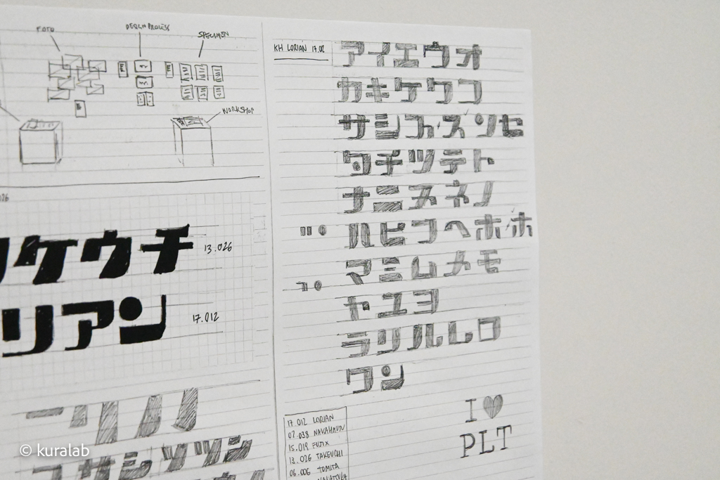いきなりPCでトレースするのではなく、紙とペンで一文字ずつラフを描き、そこからフォントデザインへとつなげていくオーソドックスな作業をしているそうですが、本人によれば「50音すべてをおよそ1時間で描けるし、その方が細部にもこだわれる」とのことで、驚くべき速さと集中力で、精度の高いスケッチを仕上げていました。