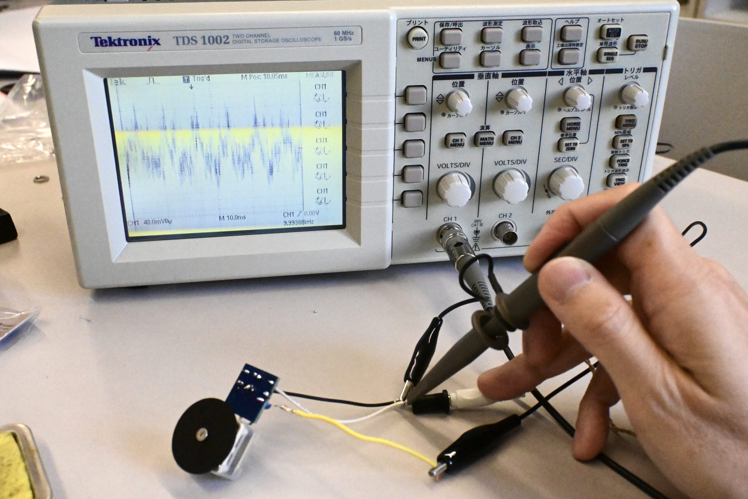 キャッチした電波の中から音声信号だけを取り出すのが「ゲルマニウムダイオード」です。ダイオードは、電流を一方向にしか流さない性質があり、この整流作用によって高周波の搬送波から音声成分を取り出せるのです。オシロスコープで波形を確認すると、受信できていることがわかりました。